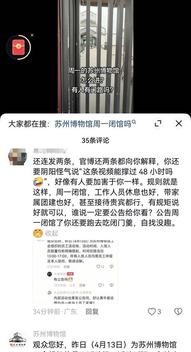 4日,在这位网友发布的视频评论区,苏州博物馆官方账号回复称:观众您好,昨日(4日)为苏州博物馆工会组织的员工活动场,活动时间、入馆人员数量均有明确限制,时间仅限当:00-17:00,所有入馆人员均需员工申报及本人陪同,敬请谅解。
